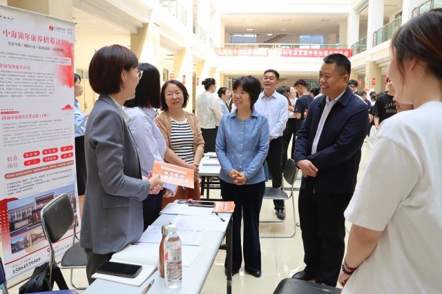为深入贯彻实施积极应对人口老龄化国家战略和落实国家促就业有关决策部署,有效推动养老行业产业人才招聘和高校毕业生求职就业。5月9日,在山东省民政厅的大力支持下,学校举办养老服务管理本科专业首届毕业生就业双选会。学校党委书记吕晓黎、省民政厅养老处一级调研员田崇杰出席活动,来自北京、天津、青岛、河北、山东的35家知名养老机构和相关单位到场招聘,提供就业岗位400多个,首届养老服务管理专业毕业生以及社会工作、健康服务与管理等专业的300余名毕业生参加招聘会。