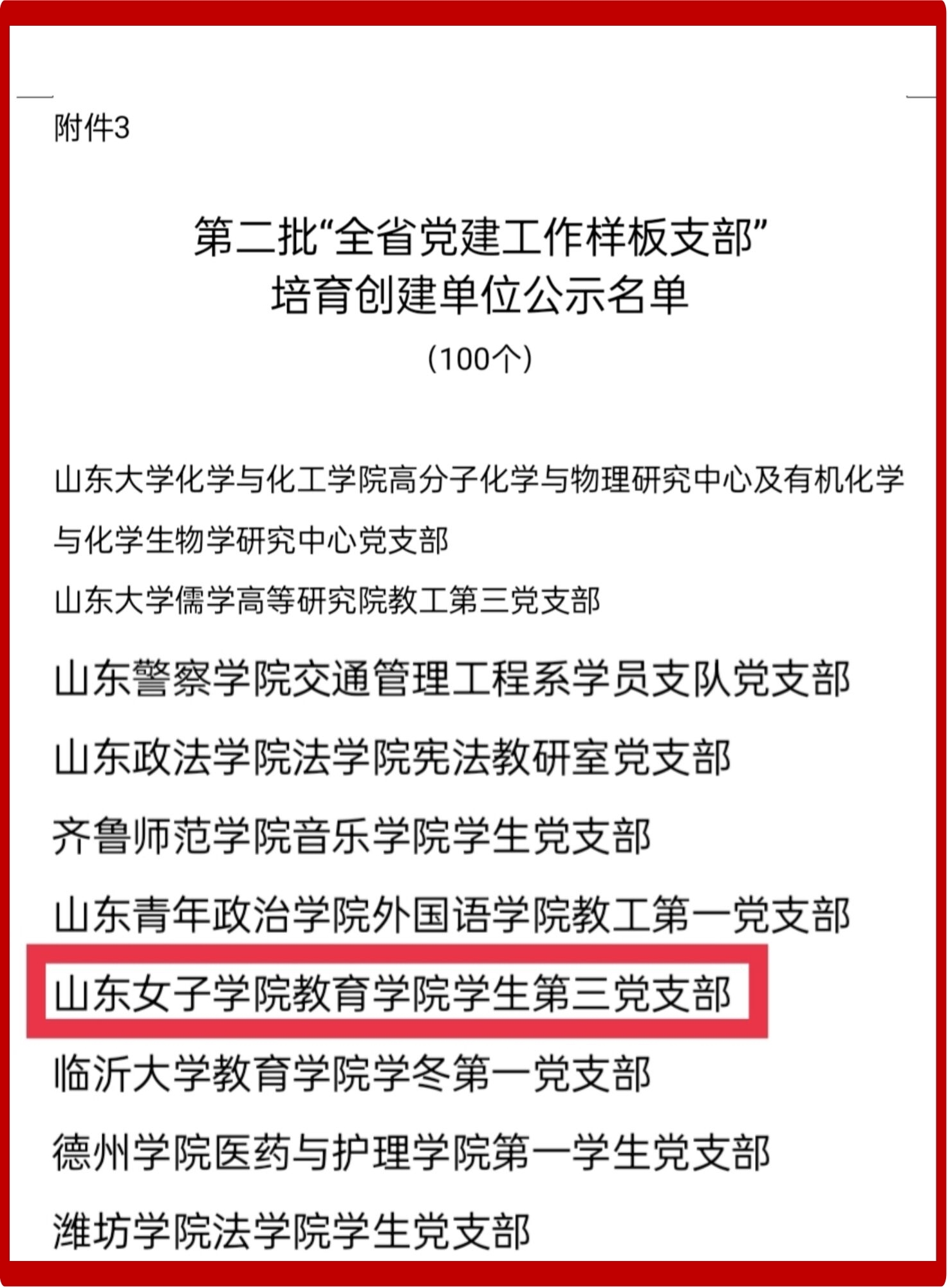 学院党委连年在学校基层党委(总支)述职考核中被评为“好”等次,先后荣获学校先进基层党组织、全省高校党建标杆院系培育建设单位荣誉称号,“亮旗工程”获评山东省高校院系党总支书记抓基层党建突破项目优秀成果。学生第三党支部获评全省高校党建样板支部培育建设单位。学院师生党员中,不断涌现出山东省优秀辅导员、山东省高校“最美家庭”、中国大学生自强之星、国家奖学金获得者、山东省优秀学生、济南市青年学术技术带头人等优秀人才。1人获山东省首届党务工作者素质能力大赛一等奖,1人入选省属高校十九届五中全会宣讲团成员,1人获评全省高校思想政治教育优秀成果三等奖,1人讲党课获评山东省高校精品党课三等奖等。1人因积极投身疫情防控工作,获山东省青春贡献奖,并被济南市历城区委、区人民政府记“三等功”。