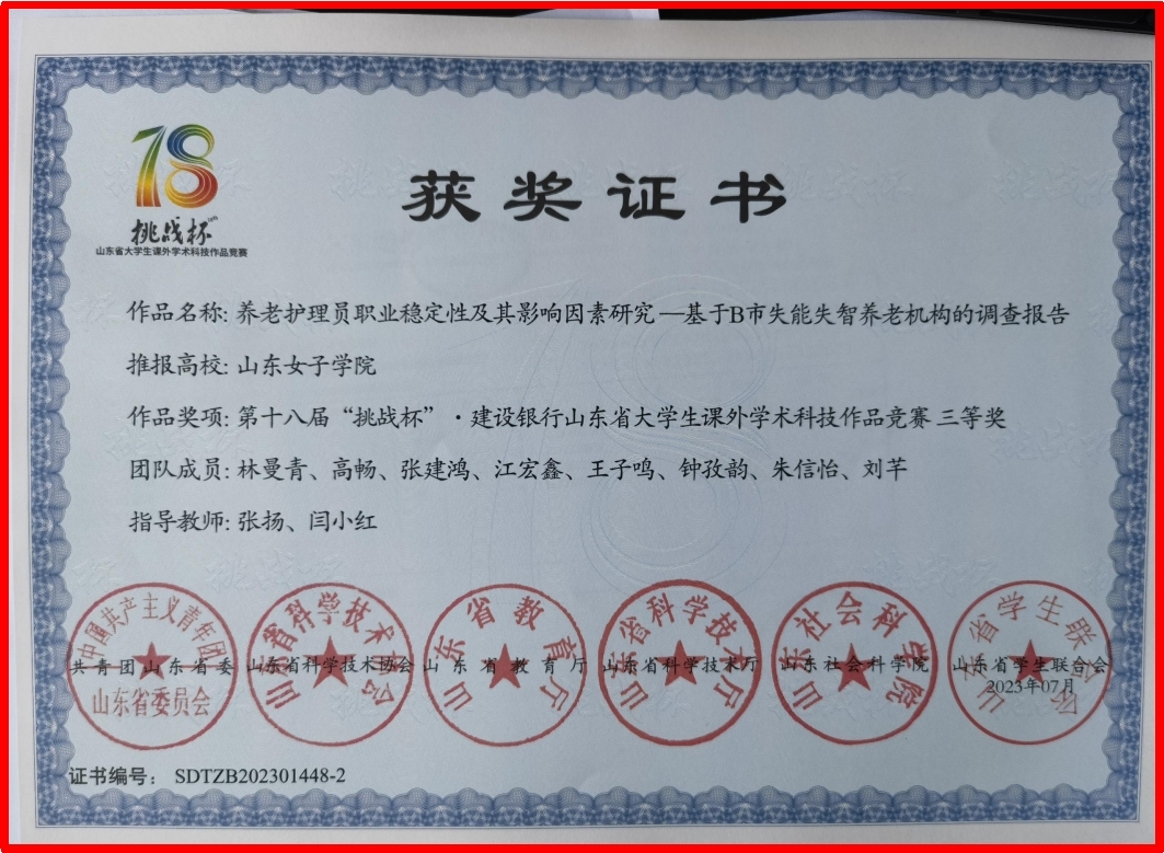 学科专业平台不断实现新突破。先后获批养老服务数字化治理文科实验室、基于大数据的健康养老服务人才团队、黄河流域养老服务高质量发展协同创新中心、济南海佑团队等多个省部级科研平台。承担20余项国家社科基金、民政部、教育部、省社科规划等高水平科研项目;连续获批获得教学创新大赛省级二等奖、山东省一流本科课程山东省普通本科高校劳动教育典型教学案例、实践项目等多项。